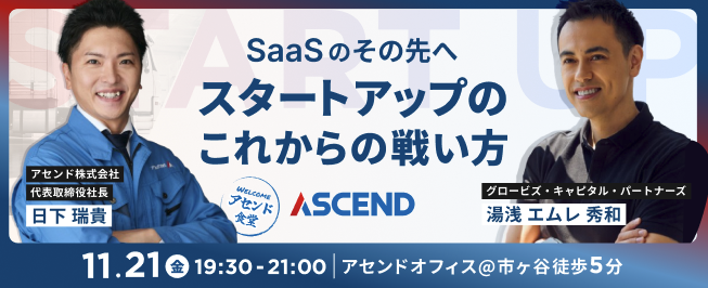 創業時から続く、「同じ釜の飯を食う」仲間づくりを体現する「アセンド食堂」。食事を通じた交流に加え、この度、シリーズB進出を記念して特別ゲストをお招きし、「スタートアップの事業戦略」や「キャリア構築」など様々なテーマでセッションをお送りします。